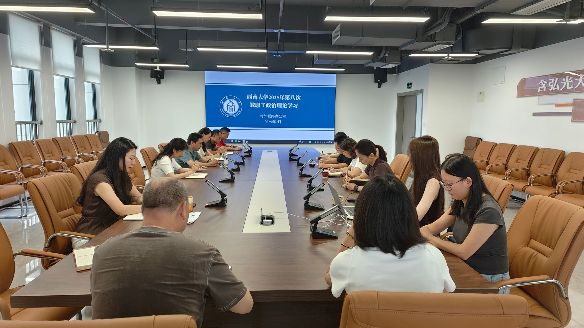2025年9月3日上午,对外联络办公室(重庆西南大学教育基金会和校友会秘书处)在出版社大楼12楼会议室组织召开了2025年第八次教职工政治理论学习会议。本次学习会议由唐军主任主持,全体教职工参加。