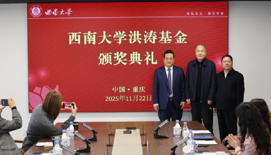 11月22日,西南大学洪涛基金颁奖仪式在出版大楼12楼对外联络办公室隆重举行。学校党委常委、副校长葛信勇,洪涛基金发起人, 山西宣传文化名家工作室领衔人 刘洪生、山西盛世集团董事长董涛江,西南大学教师教育学院党委书记郭亮,对外联络办公室主任、教育基金会秘书长唐军以及学校有关部门负责人出席仪式,共同见证师范学子的成长荣光。