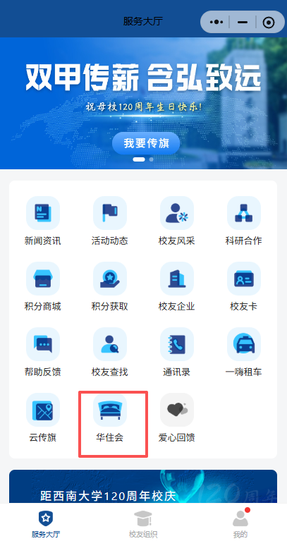 1.文末点亮“赞”+“在看”并转发本推文。2.点击公众号对话框下方菜单选择【校友服务】进入“西南大学校友总会”小程序-找到华住会小程序
