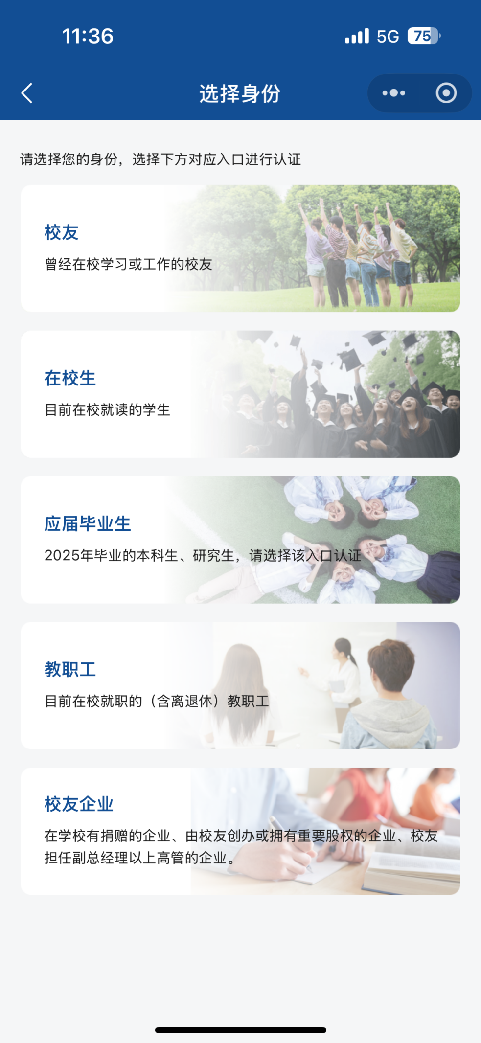 如没有注册过校友身份需要先点击【去认证】-选择身份进行定注册。注意必须是校友身份才能注册。
