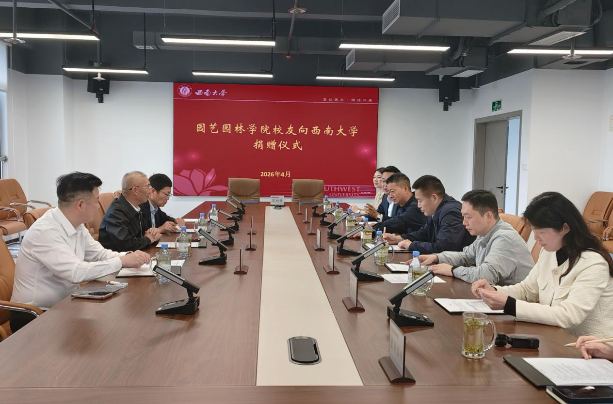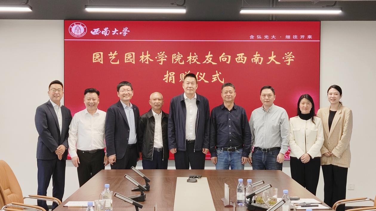 4月14日下午,园艺园林学院校友向西南大学捐赠仪式在学校出版大楼十二楼对外联络办公室会议室圆满举行。西南大学党委常委、副校长葛信勇,对外联络办公室主任、教育基金会秘书长唐军,园艺园林学院党委书记周建华,重庆吉盛生态园林绿化有限公司董事长丁吉强,园艺园林学院1995级校友、吉盛生态总经理邢佑浩,副总经理蒋玲,园艺园林学院1995级校友、广东瑞和生态文旅有限公司总经理王海林以及对外联络办公室有关工作人员参加捐赠仪式。