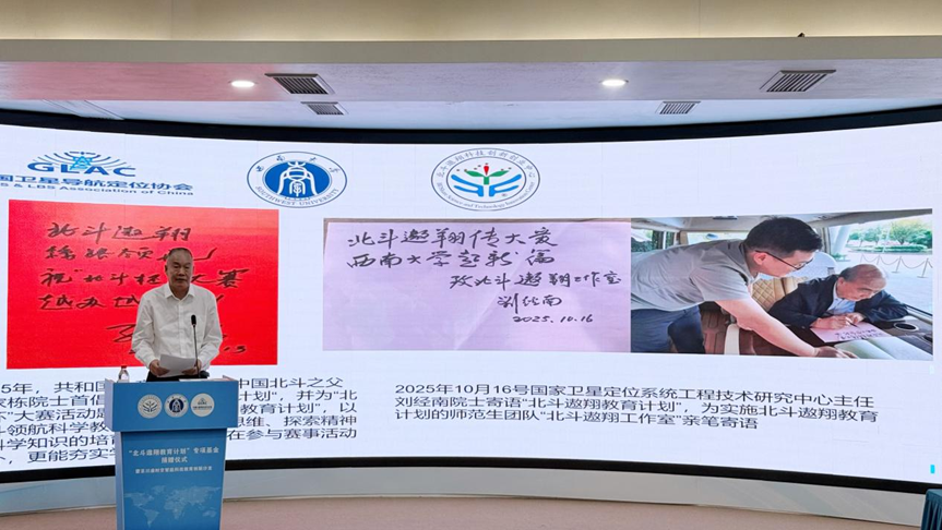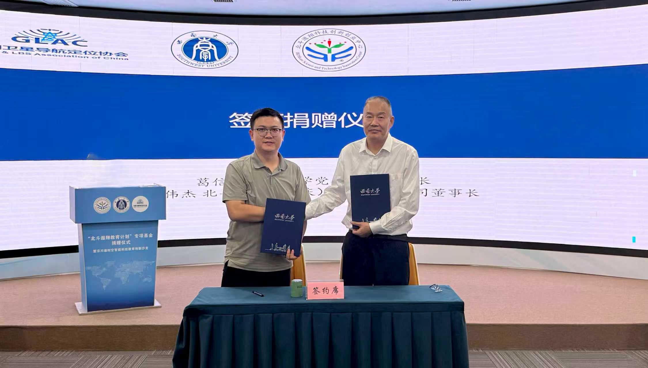 10月17日,“北斗遨翔教育计划”专项基金捐赠仪式在西南大学(重庆)产业技术研究院3号楼1楼多功能厅举行。中国卫星导航定位协会常务副会长赵继成,学校副校长葛信勇,北斗遨翔(重庆)科技有限公司董事长、西南大学在读博士唐伟杰,中国卫星导航定位协会相关领导,以及学校对外联络办公室、教师教育学院等相关单位负责人参加会议。