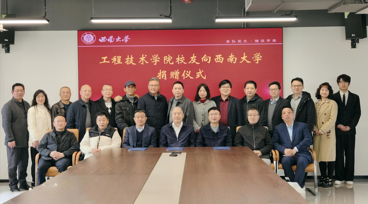 2025年12月28日下午,工程技术学院90级校友向西南大学捐赠仪式在学校出版大楼十二楼对外联络办公室会议室举行。西南大学党委常委、副校长葛信勇,教育基金会理事、校友企业联合会会长黎和生,学校对外联络办公室主任、教育基金会秘书长唐军,工程技术学院党委书记古文海,工程技术学院院长、党委副书记谢守勇,以及对外联络办公室、工程技术学院有关人员参加仪式。工程技术学院90级机制、机化班校友代表何中存、安锋年、王长生、杨秀峰、薛显云、郑弟红、张锐、谢会川、高立洪、宗勇、祝诗平、王胜等返校参加仪式。