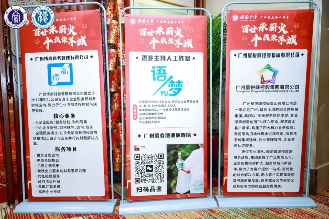本次年会得到众多校友企业的大力支持,赞助企业及单位包括(按文档提及顺序):广东信生物科技有限公司、邓校长消防培训、贵州警天下酒业有限公司、威臣羽毛球、朱身勇婚姻管理机构、广州一宸烘焙有限公司、广州博高财务管理有限公司、广州星悦峰控股集团有限公司、语梦主持人工作室、广州碧春酒业旗舰店、汇丰卓越理财等,校友企业的鼎力相助见证了 “西大人” 守望相助的深厚情谊。