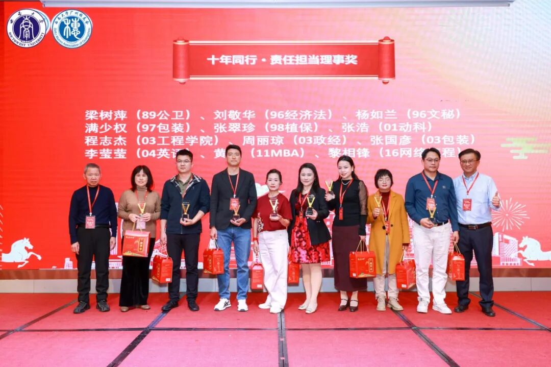 校友会独具匠心准备了“十年同行”荣誉表彰环节。雷建军会长、杨永平执行会长等领导颁发了“年度优秀俱乐部、年度卓越理事奖、责任担当理事奖、校友工作同行奖、暖心奉献奖、同行贡献奖、热心校友奖”奖杯、礼品,表彰为校友会发展默默奉献的骨干成员。年会还增补了第三届广州校友理事会成员,为新增补人员颁发了聘书。