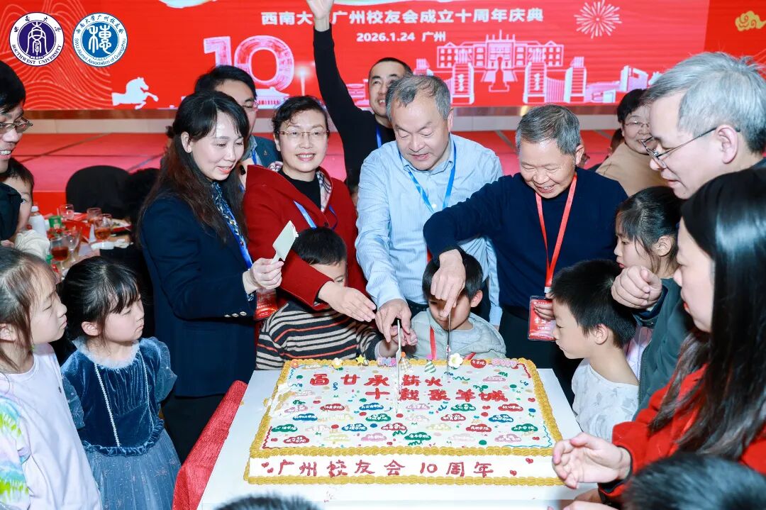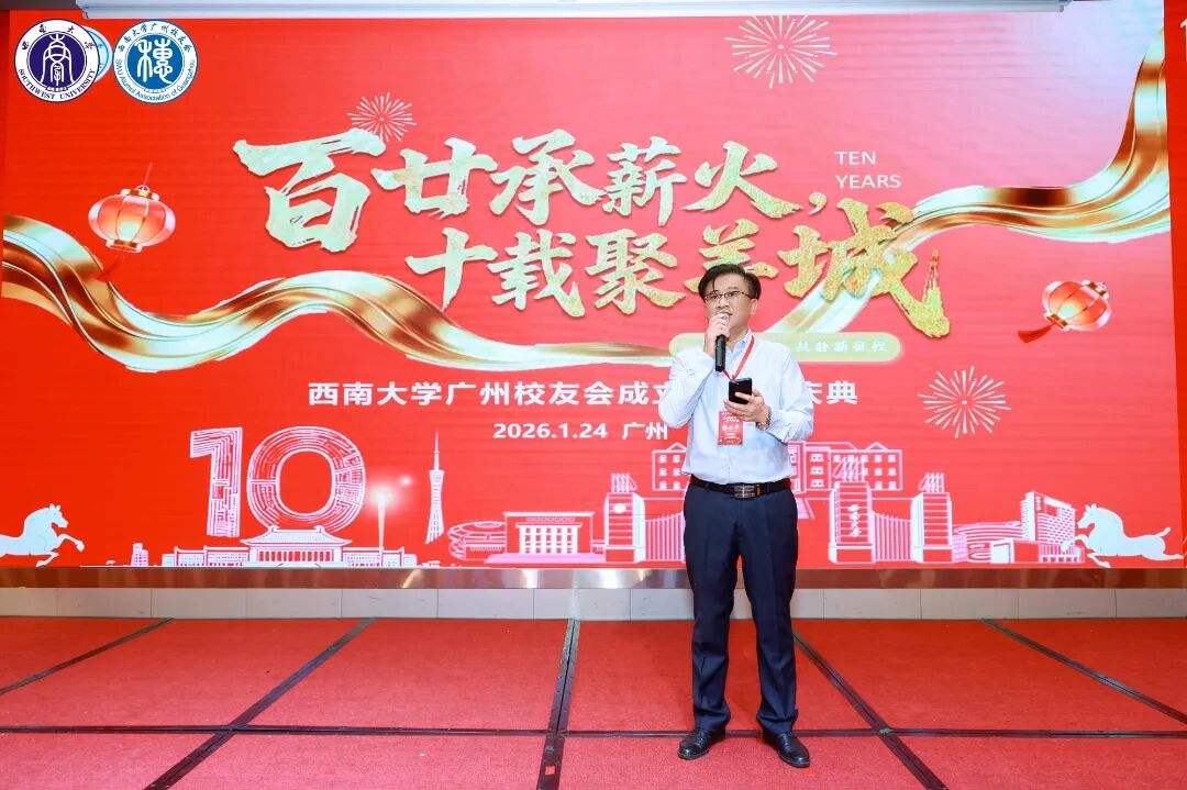 西南大学广州校友会十周年年会于2026年1月24日在广东亚洲国际大酒店隆重举行。活动以“百廿承薪火·十载聚羊城”为主题,庆祝校友会成立十周年。来自西南大学校友总会的领导嘉宾,西南大学经管学院的领导嘉宾,各兄弟校友会嘉宾,贵州大学广州校友会、重庆工商大学广州校友会和贵州省西南大学校友会的嘉宾,部分特邀嘉宾,和广州校友会的校友们及家属齐聚一堂,300多人共同见证了这次盛会。