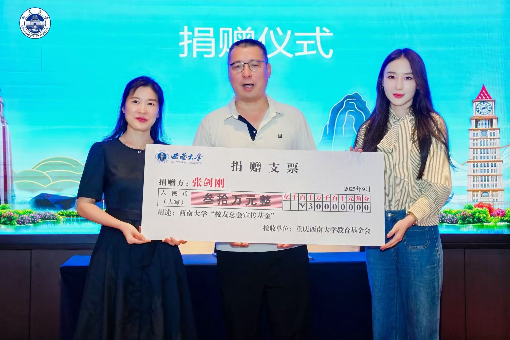 随后,张剑刚向校友总会捐赠30万元,用于校友总会视频号短视频大赛。会议举行了捐赠仪式,对外联络办公室副主任、校友总会副秘书长陈建英,信息与宣传科科长曾卓益熳接受捐赠支票。