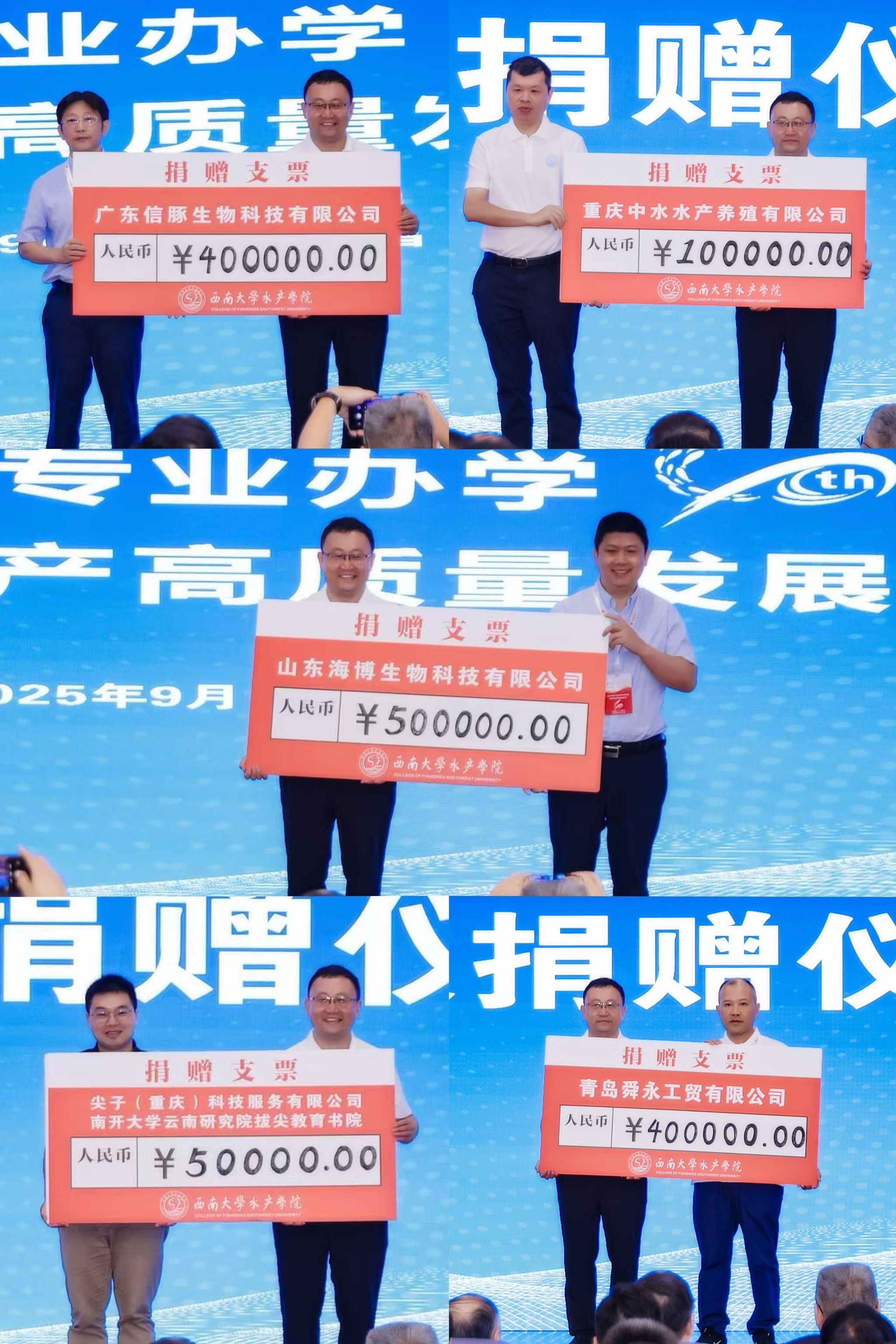 会上,以山东海博农牧科技有限公司董事长何立发,广东信豚生物科技有限公司董事长朱旺明,青岛舜永工贸有限公司总经理晏发勇,重庆中水水产养殖有限公司总经理胡顺沛,爱尖子(重庆)科技服务有限公司总经理廖富勇为代表的优秀校友,慷慨捐资兴教,以实际行动反哺母校,助力学校、学院人才培养和未来发展。