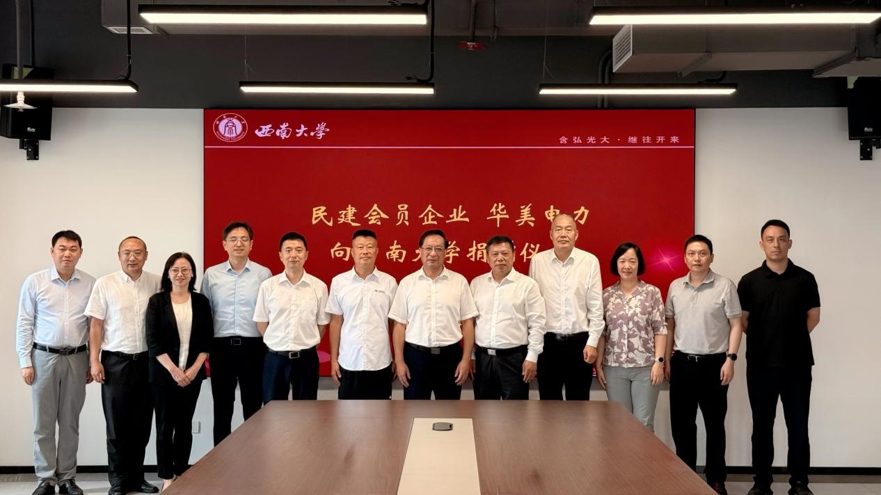 9月29日,校友企业重庆华美电力设备有限责任公司向西南大学捐赠仪式在学校出版社大楼12楼对外联络办公室会议室举行。重庆市人大常委会副主任、民建中央副主席、重庆市委会主委沈金强,民建中央委员、民建重庆市委会专职副主委、重庆市政协常委刘伟,民建重庆市委会副主委、重庆市政协常委、西南大学经济管理学院黄俊教授,大渡口区政协副主席、民建市委会委员、民建大渡口区委会主委王秀琼,民建市委会委员、民建大渡口区委会专职副主委徐彤彤,“华美励志奖学金”发起人、西南大学1996级校友、重庆华美电力设备有限责任公司董事长徐建,重庆市人大常委会干部邓青波,重庆华美电力设备有限责任公司副总经理邱强,重庆华美电力设备有限责任公司办公室主任马筱倩等出席会议。西南大学党委书记、教育基金会理事长张卫国,党委常委、副校长葛信勇,对外联络办公室主任、教育基金会秘书长唐军,基本建设管理处处长、教育基金会理事罗利江,助学中心主任孙金春,民建西南大学总支部主委刘玉等参加会议。